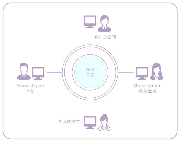 分布在日本主要都市的Marss Japan全营业所时刻处于网络连接,为会议场地提供清晰的声音和画质。通过使用此系统,可大幅度减少出差费用和时间,以实现与客户以及其子公司顺利交流沟通。
