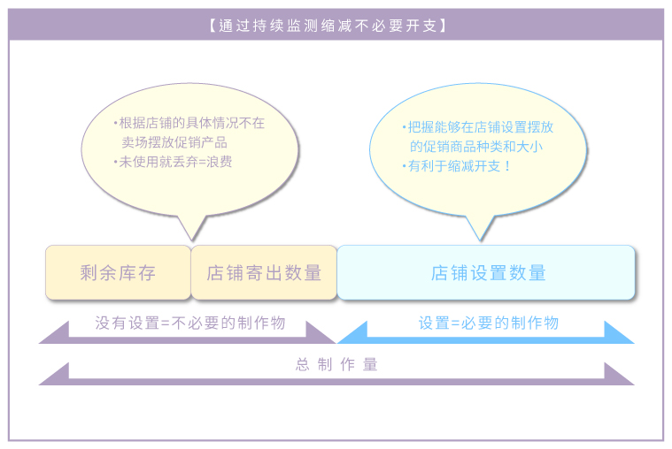 有关商品的促销工具,由本公司的促销配送中心统一管理。根据各客户的指示,我们可包揽从SP工具的制作、配送、到达、确认、到专用物流仓库管理的一切过程。目前需要的分工、下达各操作的指示、配送手续、确保仓库上的大量时间和人工将不再需要,可推进业务的效率化。