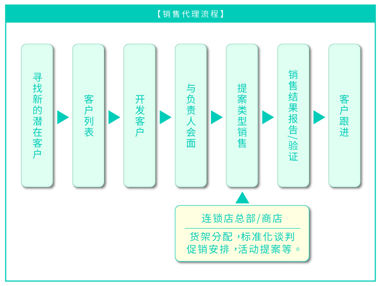 我们将代表客户,与批发商,连锁总部,企业等等进行合作,努力拓展销售渠道。 在连锁总部和主要连锁店,我们还会对货架分配和标准化问题进行商讨,安排促销,进行活动提案等,帮客户解决有关销售的课题以及不安。