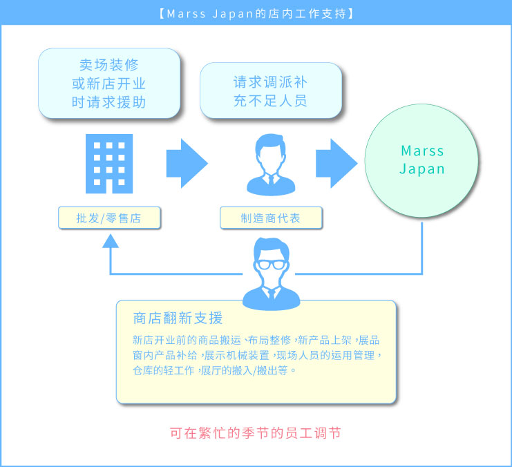 我们可在店铺装修或新店开业前的繁忙时期提供即时地人力资源帮助,例如商品搬运、陈列,以及新产品上架等。除了店铺,也可为仓库内的轻作业或展会活动中的搬入、搬出等工作提供人力。
