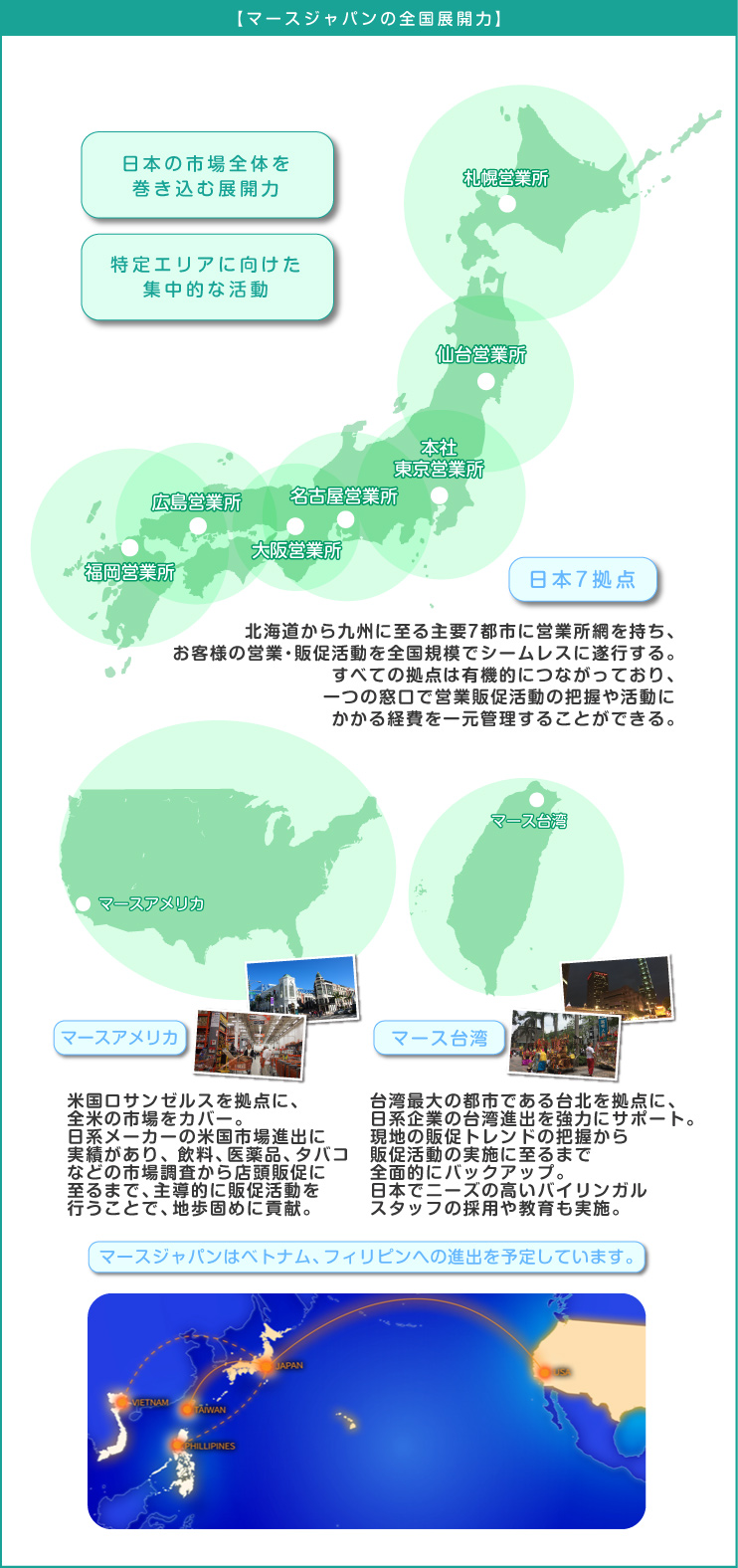 場所や業種、国を問わず、高いクオリティの均一なサービスを、いつでもお届けすることが私たちの使命。それを支えるのが、全国7拠点に広がるマースジャパンの営業ネットワークです。それぞれの地域にしっかりと地盤を築き、地域から収集した情報を基にチャネル開拓・深耕を行うと共に、各拠点が有機的につながることで、全国でスケール感のある営業・販促活動を展開します。