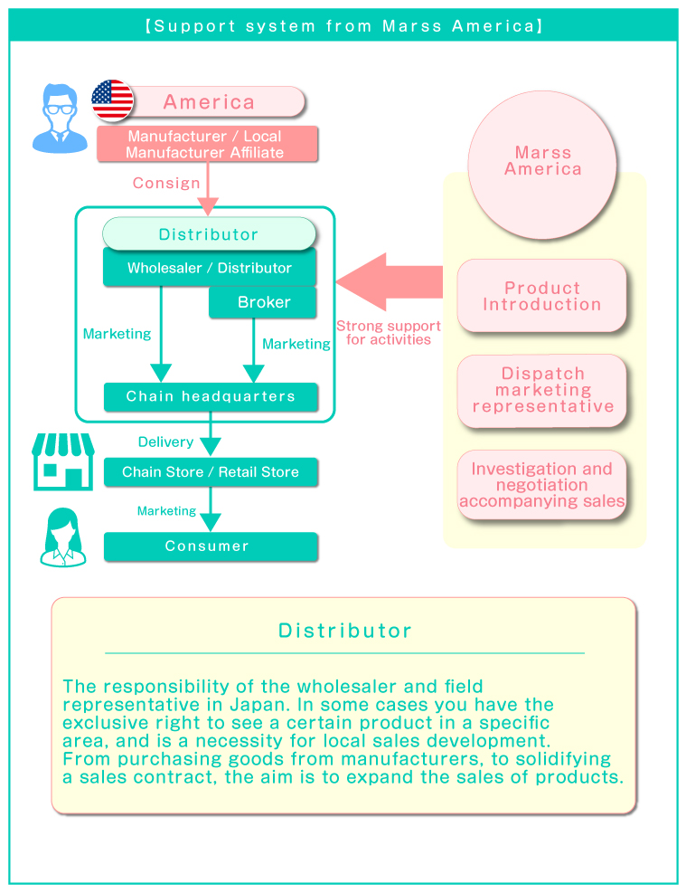 Marss America's strength lies in it's ability to flexibly enter each one of these channels. It is important to build relationships with various distributors and sales reps who have strong ties with a certain ethnic group. Business negotiations with sales reps can benefit by introducing bilingual staff who can speak English along with Japanese, Chinese, Korean, Spanish, Vietnamese, etc.