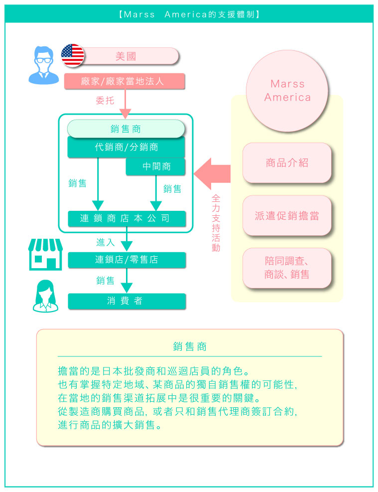 能夠巧妙進入這樣渠道的就是Marss America的特點。重要的是把握各地域人種的平衡,並且和稱作分銷商和代理商的販賣代理者建立好良好的關係。例如,向賣場負責人進行提案的時候,在與銷售代理商進行仔細的會議討論之後,多國語言的員工可以使用英語以外的日語、中文、韓語、西班牙語、越南語、其他語言等促進更加密切的商談。